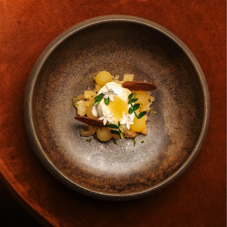 Apple wood, milk ice cream, bay leaves, yuzu, macieira.