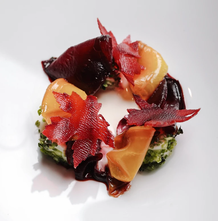 Beetroot, young goat cheese, aromatic crumble,