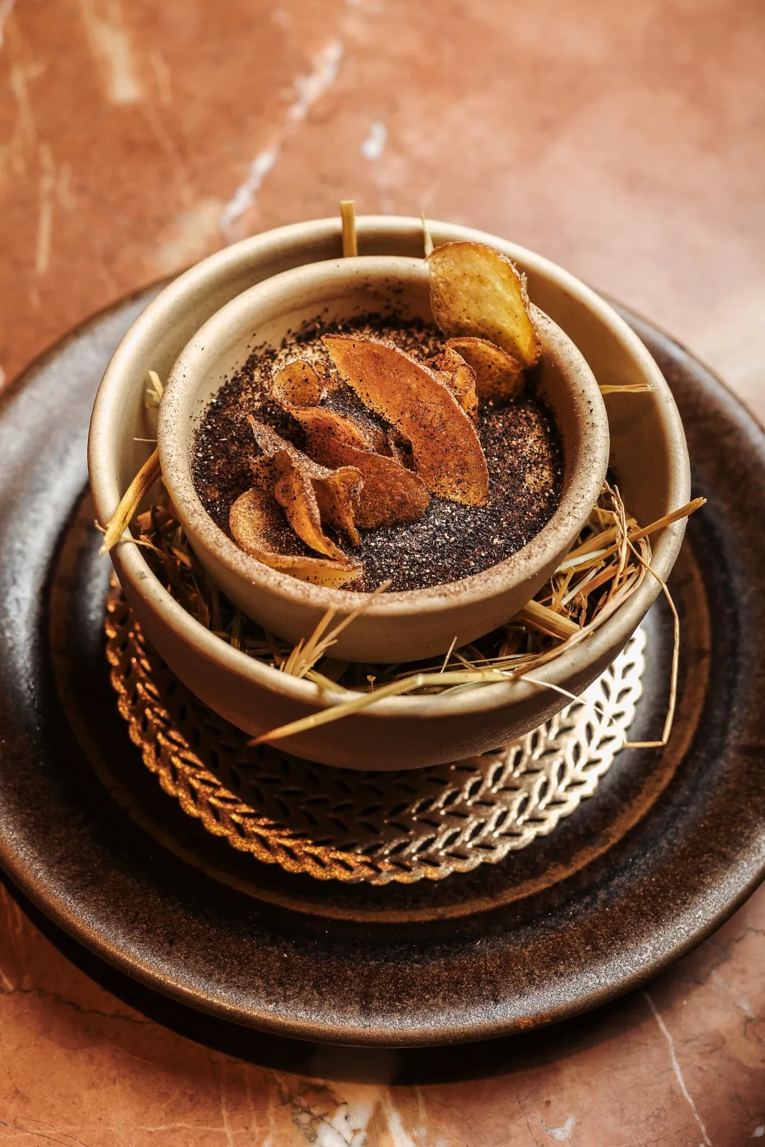 Mushrooms, aromatic crumble, fermented potatoes chips.