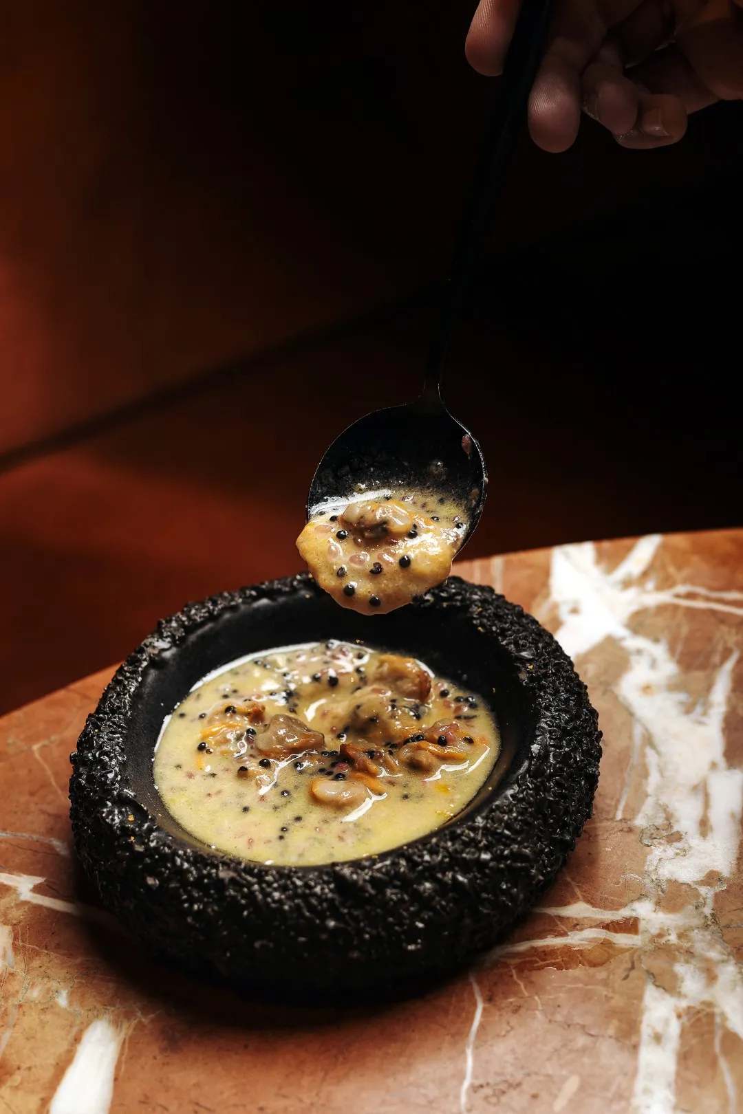 Rye bread +10 | Caviar +15 | Beet & goat +18 | Hake +32 | Black pork +32 | Oyster +18 |